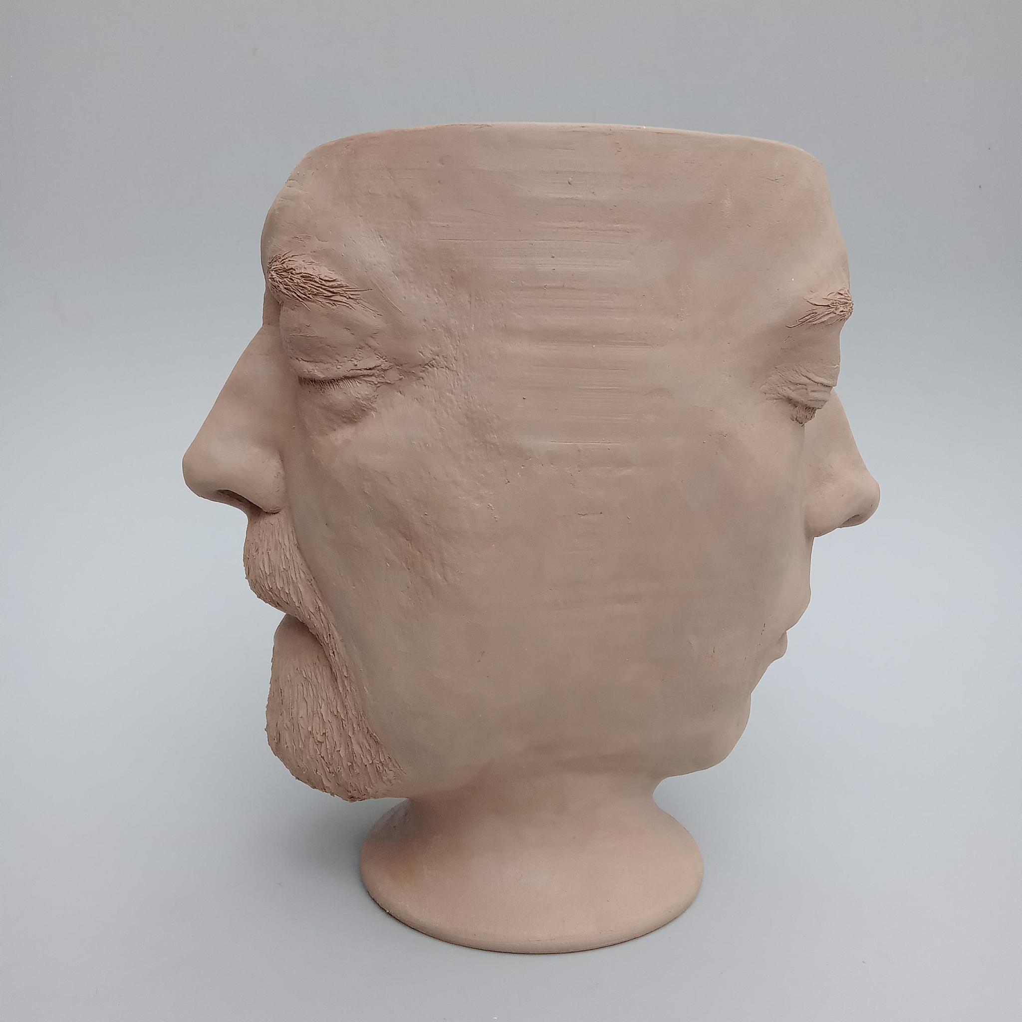 The image above shows a new artpiece in progress. These are my father’s and my own faces combined in a clay cup. This sculpture is still unfired. A similar two-faced head can be found in depictions of Janus, the Roman god of transitions, new beginnings and doorways. Janus also gave his name to our month January.